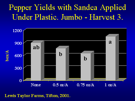 Pepper Yields with Sandea Applied Under Plastic. Jumbo - Harvest 3. <BR>box/A<BR>Lewis Taylor Farms, Tifton, 2001.<BR>a<BR>a<BR>a<BR>b<BR>ab<BR>b<BR>a<BR>