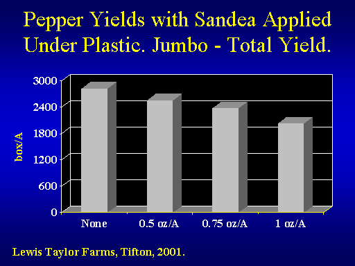 Pepper Yields with Sandea Applied Under Plastic. Jumbo - Total Yield. <BR>box/A<BR>Lewis Taylor Farms, Tifton, 2001.<BR>