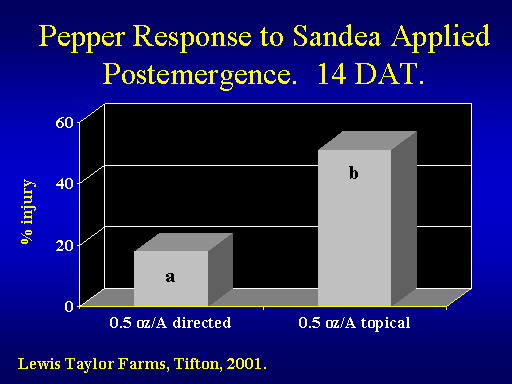 % injury<BR>Lewis Taylor Farms, Tifton, 2001.<BR>a<BR>b<BR>Pepper Response to Sandea Applied Postemergence.  14 DAT. <BR>