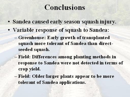 <BR>Greenhouse: Early growth of transplanted squash more tolerant of Sandea than direct-seeded squash.