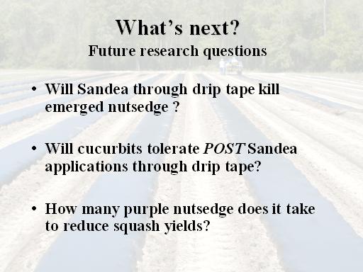 What’s next?Future research questions<BR>Will Sandea through drip tape kill emerged nutsedge ?