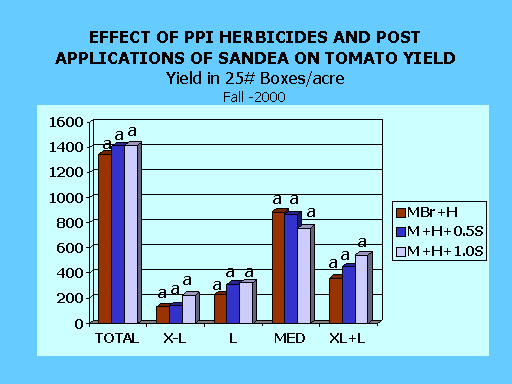 EFFECT OF PPI HERBICIDES AND POST APPLICATIONS OF SANDEA ON TOMATO YIELD Yield in 25# Boxes/acreFall -2000<BR> a<BR>a<BR>a<BR>a<BR>a<BR>a<BR>a<BR>a  a<BR>a<BR>a<BR>a<BR>a<BR>a<BR>a<BR>
