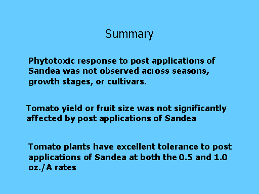 Summary<BR>Phytotoxic response to post applications of Sandea was not observed across seasons, growth stages, or cultivars.<BR>Tomato yield or fruit size was not significantly affected by post applications of Sandea<BR>Tomato plants have excellent tolerance to post applications of Sandea at both the 0.5 and 1.0 oz./A rates<BR>