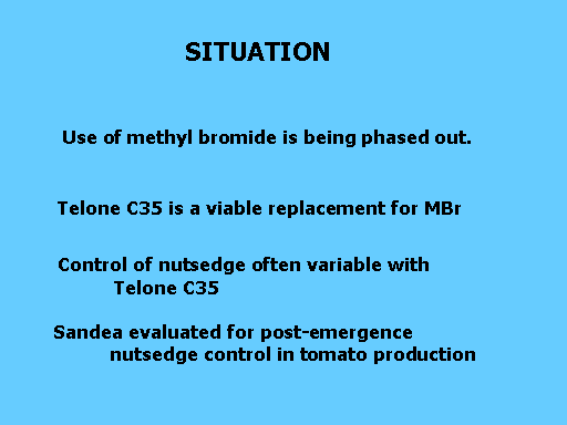 SITUATION<BR>Use of methyl bromide is being phased out.<BR>Telone C35 is a viable replacement for MBr<BR>Control of nutsedge often variable with 	Telone C35<BR>