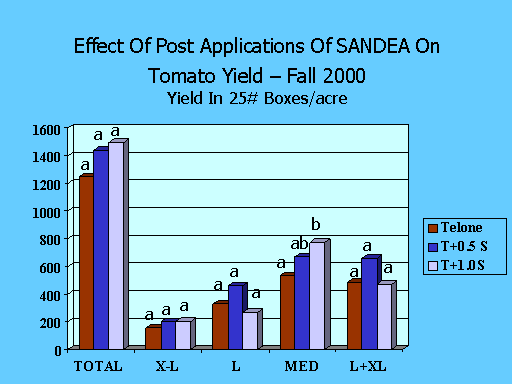 Effect Of Post Applications Of SANDEA On Tomato Yield – Fall 2000 Yield In 25# Boxes/acre<BR>a<BR>a<BR>a<BR>a<BR>a<BR> a<BR> a<BR>a<BR> a<BR>a<BR>ab<BR> b<BR>a<BR>a<BR>a<BR>