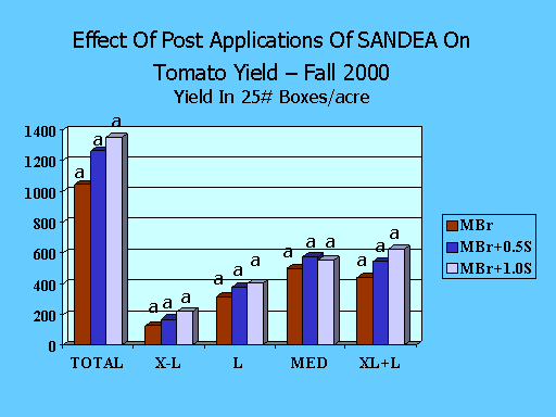 Effect Of Post Applications Of SANDEA On Tomato Yield – Fall 2000 Yield In 25# Boxes/acre<BR>a<BR>a<BR>a<BR>a<BR>a<BR>a<BR>a<BR> a<BR>a<BR>a<BR>a<BR>a<BR>a<BR>a<BR>a<BR>