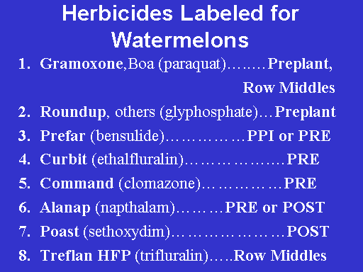 Herbicides Labeled for Watermelons<BR>Gramoxone,Boa (paraquat)…..…Preplant,