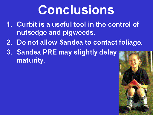Conclusions<BR>Curbit is a useful tool in the control of nutsedge and pigweeds.