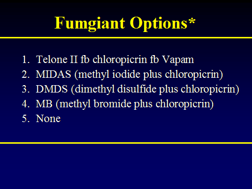 Fumgiant Options*<BR> <BR>Telone II fb chloropicrin fb Vapam <BR>MIDAS (methyl iodide plus chloropicrin) <BR>DMDS (dimethyl disulfide plus chloropicrin) <BR>MB (methyl bromide plus chloropicrin) <BR>None<BR>