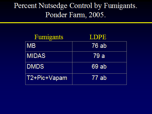 Fumigants<BR>LDPE<BR>Percent Nutsedge Control by Fumigants.  Ponder Farm, 2005.<BR>