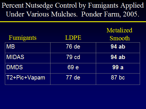 Fumigants<BR>LDPE<BR>Percent Nutsedge Control by Fumigants Applied Under Various Mulches.  Ponder Farm, 2005.<BR>Metalized Smooth<BR>
