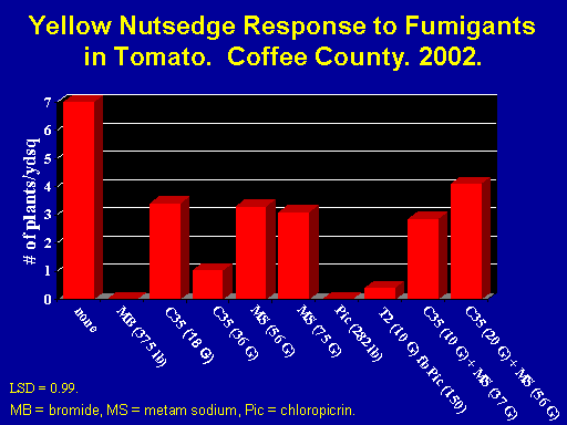 Yellow Nutsedge Response to Fumigants in Tomato.  Coffee County. 2002.<BR># of plants/ydsq<BR>none<BR>MB (375 lb)<BR>C35 (18 G)<BR>C35 (36 G)<BR>MS (56 G)<BR>MS (75 G)<BR>C35 (10 G) + MS (37 G)<BR>C35 (20 G) + MS (56 G)<BR>LSD = 0.99.