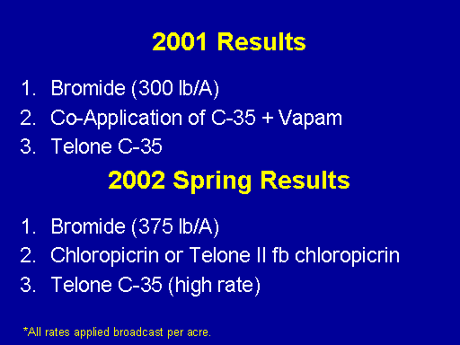 <BR>Telone C-35<BR>*All rates applied broadcast per acre.<BR>2002 Spring Results<BR>Bromide (375 lb/A)