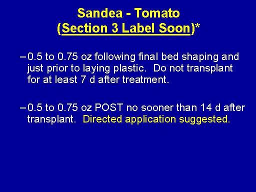 Sandea - Tomato(Section 3 Label Soon)*<BR>0.5 to 0.75 oz following final bed shaping and just prior to laying plastic.  Do not transplant for at least 7 d after treatment.