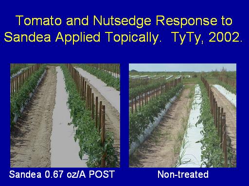 Tomato and Nutsedge Response to Sandea Applied Topically.  TyTy, 2002.<BR>Sandea 0.67 oz/A POST		Non-treated<BR>