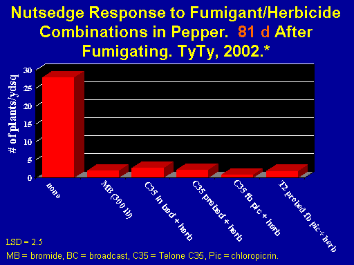 Nutsedge Response to Fumigant/Herbicide Combinations in Pepper.  81 d After Fumigating. TyTy, 2002.*<BR># of plants/ydsq<BR>none<BR>MB (300 lb)<BR>C35 in bed + herb<BR>LSD = 2.5