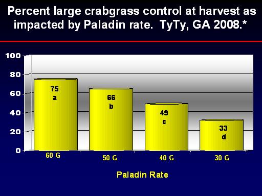 Percent large crabgrass control at harvest as impacted by Paladin rate.  TyTy, GA 2008.*<BR>50 G<BR>30 G<BR>40 G<BR>Paladin Rate<BR>75 a<BR>66 b<BR>49 c<BR>60 G <BR>33 d<BR>