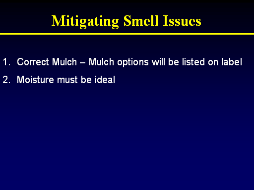1.  Correct Mulch – Mulch options will be listed on label <BR>2.  Moisture must be ideal <BR>		<BR>Mitigating Smell Issues<BR>