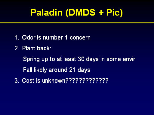 Odor is number 1 concern <BR> Plant back:   <BR>     Spring up to at least 30 days in some envir <BR>     Fall likely around 21 days <BR>3.	 Cost is unknown?????????????	<BR>Paladin (DMDS + Pic)<BR>