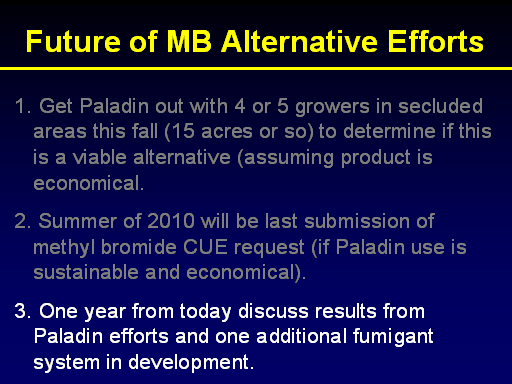 Get Paladin out with 4 or 5 growers in secluded areas this fall (15 acres or so) to determine if this is a viable alternative (assuming product is economical. <BR>2. Summer of 2010 will be last submission of methyl bromide CUE request (if Paladin use is sustainable and economical). <BR>3.	 One year from today discuss results from Paladin efforts and one additional fumigant system in development.	<BR>Future of MB Alternative Efforts<BR>