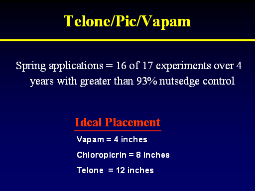 Telone/Pic/Vapam<BR>Spring applications = 16 of 17 experiments over 4 years with greater than 93% nutsedge control<BR>Vapam = 4 inches <BR>Chloropicrin = 8 inches <BR>Telone  = 12 inches<BR>Ideal Placement<BR>