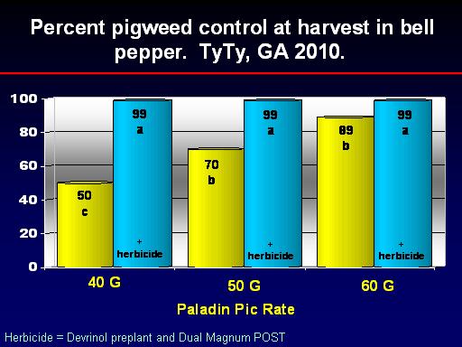 Percent pigweed control at harvest in bell pepper.  TyTy, GA 2010.<BR>50 G<BR>40 G<BR>Paladin Pic Rate<BR>50 c<BR>70 b<BR>99 a<BR>60 G <BR>89 b<BR>99 a<BR>99 a<BR>+ herbicide<BR>+ herbicide<BR>+ herbicide<BR>Herbicide = Devrinol preplant and Dual Magnum POST<BR>