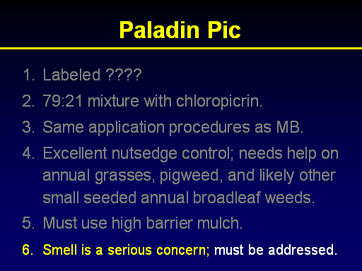 Paladin Pic<BR>Labeled ???? <BR>79:21 mixture with chloropicrin. <BR>Same application procedures as MB. <BR>Excellent nutsedge control; needs help on annual grasses, pigweed, and likely other small seeded annual broadleaf weeds. <BR>Must use high barrier mulch.  <BR>Smell is a serious concern; must be addressed. <BR>
