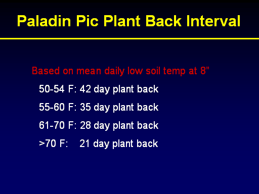 <BR>	   Based on mean daily low soil temp at 8” <BR>		50-54 F: 42 day plant back <BR>		55-60 F: 35 day plant back <BR>		61-70 F: 28 day plant back <BR>		>70 F:    21 day plant back      <BR>Paladin Pic Plant Back Interval<BR>