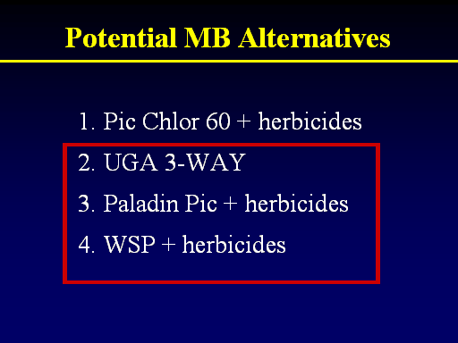 Potential MB Alternatives<BR>Pic Chlor 60 + herbicides <BR>UGA 3-WAY	 <BR>Paladin Pic + herbicides <BR>WSP + herbicides<BR>