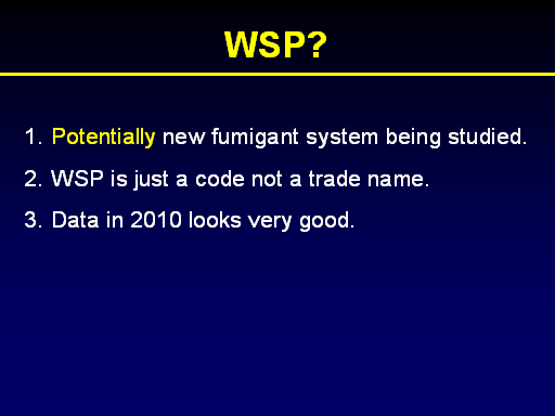 Potentially new fumigant system being studied.   <BR> WSP is just a code not a trade name. <BR> Data in 2010 looks very good.<BR>WSP?<BR>