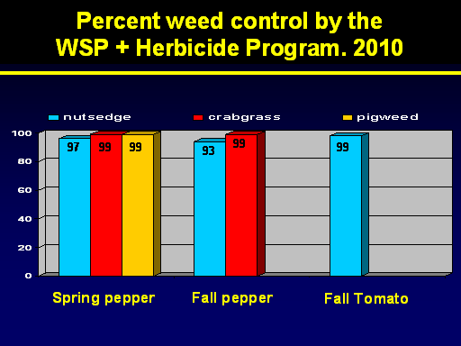 Percent weed control by the               WSP + Herbicide Program. 2010<BR>97<BR>Spring pepper<BR>Fall pepper<BR>Fall Tomato<BR>93<BR>99<BR>99<BR>99<BR>99<BR>