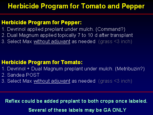Several of these labels may be GA ONLY<BR>Herbicide Program for Pepper:   1. Devrinol applied preplant under mulch. (Command?) 2. Dual Magnum applied topically 7 to 10 d after transplant 3. Select Max without adjuvant as needed  (grass <3 inch) <BR>Herbicide Program for Tomato and Pepper<BR>Herbicide Program for Tomato:   1. Devrinol + Dual Magnum preplant under mulch. (Metribuzin?) 2. Sandea POST  3. Select Max without adjuvant as needed  (grass <3 inch) <BR>Reflex could be added preplant to both crops once labeled.<BR>