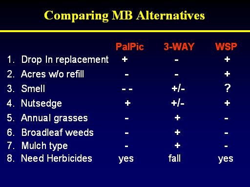 Comparing MB Alternatives<BR>Drop In replacement	 + 	 	  -		  + <BR>Acres w/o refill		  -		  -		  + <BR>Smell			 - -		 +/-		  ? <BR>Nutsedge			  +	         +/-		  + <BR>Annual grasses 		  -		  +		  - <BR>Broadleaf weeds 	  -		  +		  - <BR>Mulch type			  -		  +		  - <BR>Need Herbicides		yes		fall		yes<BR> PalPic       3-WAY	 WSP<BR>