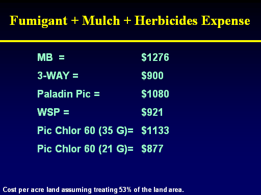 Fumigant + Mulch + Herbicides Expense<BR>	<BR>MB  = 			$1276 <BR>3-WAY =			$900 <BR>Paladin Pic = 		$1080 <BR>WSP =			$921 <BR>Pic Chlor 60 (35 G)=	$1133 <BR>Pic Chlor 60 (21 G)=	$877<BR>Cost per acre land assuming treating 53% of the land area.<BR>