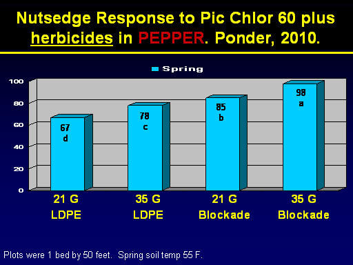 Nutsedge Response to Pic Chlor 60 plus herbicides in PEPPER. Ponder, 2010.<BR>Plots were 1 bed by 50 feet.  Spring soil temp 55 F. <BR>67 d<BR>21 G <BR>LDPE<BR>35 G <BR>LDPE<BR>21 G <BR>Blockade<BR>35 G <BR>Blockade<BR>78 c<BR>85 b<BR>98 a<BR>