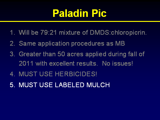 Will be 79:21 mixture of DMDS:chloropicrin. <BR>Same application procedures as MB <BR>Greater than 50 acres applied during fall of 2011 with excellent results.  No issues! <BR>MUST USE HERBICIDES! <BR>MUST USE LABELED MULCH<BR>Paladin Pic<BR>