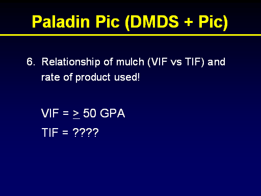 Relationship of mulch (VIF vs TIF) and rate of product used! <BR> <BR>	VIF = > 50 GPA <BR>	TIF = ????<BR>Paladin Pic (DMDS + Pic)<BR>