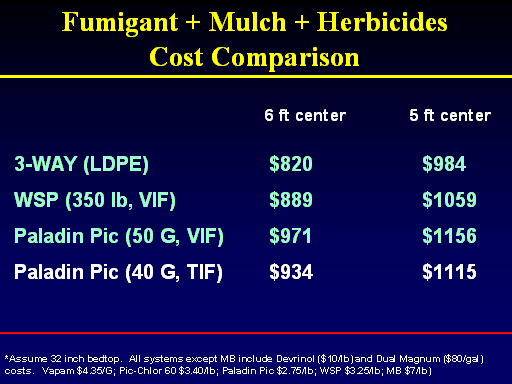 Fumigant + Mulch + Herbicides        Cost Comparison<BR>	<BR>3-WAY (LDPE) 			$820			$984 <BR>WSP (350 lb, VIF)		$889			$1059 <BR>Paladin Pic (50 G, VIF)	$971			$1156 <BR>Paladin Pic (40 G, TIF)	$934			$1115 <BR> <BR>*Assume 32 inch bedtop.  All systems except MB include Devrinol ($10/lb) and Dual Magnum ($80/gal) costs.   Vapam $4.35/G; Pic-Chlor 60 $3.40/lb; Paladin Pic $2.75/lb; WSP $3.25/lb; MB $7/lb)<BR>6 ft center<BR>5 ft center<BR>