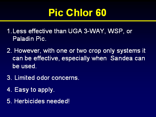 Less effective than UGA 3-WAY, WSP, or Paladin Pic. <BR> However, with one or two crop only systems it can be effective, especially when  Sandea can be used. <BR> Limited odor concerns. <BR> Easy to apply. <BR> Herbicides needed!<BR>Pic Chlor 60<BR>