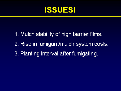 Mulch stability of high barrier films. <BR> Rise in fumigant/mulch system costs. <BR> Planting interval after fumigating. <BR>ISSUES!<BR>