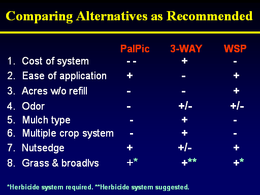 Comparing Alternatives as Recommended<BR>Cost of system		 - -		  +  		  - <BR>Ease of application	 + 	 	  -		  + <BR>Acres w/o refill		 -		  -		  + <BR>Odor				 -		 +/-		 +/- <BR>Mulch type			  -		  +		  - <BR>Multiple crop system	  -		  +		  - <BR>Nutsedge			 +	         +/-		  + <BR>Grass & broadlvs	 +*		  +**		  +* <BR> PalPic       3-WAY	 WSP<BR>*Herbicide system required. **Herbicide system suggested.<BR>