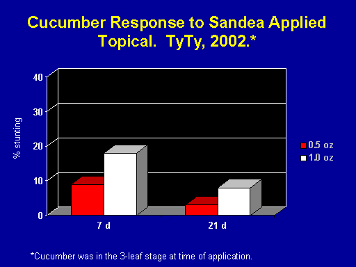 Cucumber Response to Sandea Applied Topical.  TyTy, 2002.*<BR>% stunting<BR>*Cucumber was in the 3-leaf stage at time of application.<BR>
