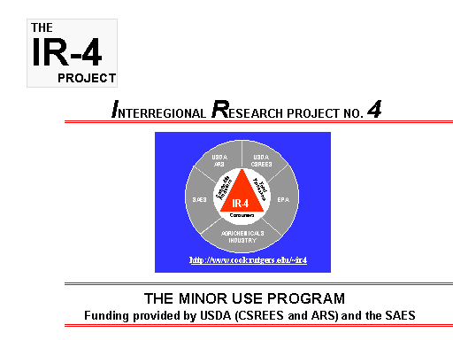 IR-4<BR>THE<BR>PROJECT<BR>INTERREGIONAL RESEARCH PROJECT NO. 4<BR>THE MINOR USE PROGRAM<BR>Funding provided by USDA (CSREES and ARS) and the SAES<BR>