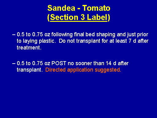 Sandea - Tomato(Section 3 Label)<BR>0.5 to 0.75 oz following final bed shaping and just prior to laying plastic.  Do not transplant for at least 7 d after treatment.
