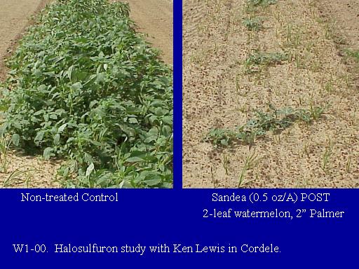<BR>					   2-leaf watermelon, 2” Palmer<BR>W1-00.  Halosulfuron study with Ken Lewis in Cordele.<BR>