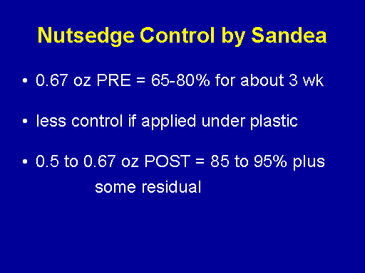 Nutsedge Control by Sandea<BR>0.67 oz PRE = 65-80% for about 3 wk