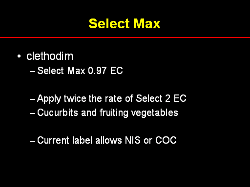 Select Max<BR>clethodim <BR>Select Max 0.97 EC  <BR> <BR>Apply twice the rate of Select 2 EC <BR>Cucurbits and fruiting vegetables <BR> <BR>Current label allows NIS or COC <BR> <BR>