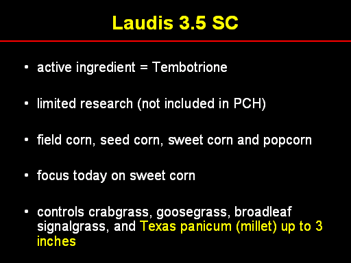 Laudis 3.5 SC<BR>active ingredient = Tembotrione <BR> <BR>limited research (not included in PCH) <BR> <BR>field corn, seed corn, sweet corn and popcorn <BR> <BR>focus today on sweet corn <BR> <BR>controls crabgrass, goosegrass, broadleaf signalgrass, and Texas panicum (millet) up to 3 inches <BR>