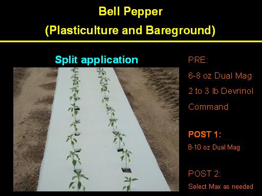 Split application<BR>Bell Pepper <BR>(Plasticulture and Bareground)<BR>PRE:  <BR>6-8 oz Dual Mag <BR>2 to 3 lb Devrinol <BR>Command  <BR> <BR>POST 1:  <BR>8-10 oz Dual Mag <BR> <BR>POST 2: <BR>Select Max as needed<BR>