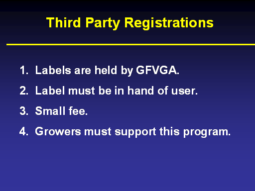 Third Party Registrations<BR>  Labels are held by GFVGA. <BR>  Label must be in hand of user. <BR>  Small fee. <BR>  Growers must support this program.<BR>